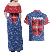 Serbia Couples Matching Off Shoulder Maxi Dress and Hawaiian Shirt with Royal Animal Crest and Tulip Floral Blue Background