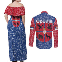 Serbia Couples Matching Off Shoulder Maxi Dress and Long Sleeve Button Shirt with Royal Animal Crest and Tulip Floral Blue Background