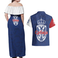 Serbia Flag Couples Matching Off Shoulder Maxi Dress and Hawaiian Shirt with Double-Headed Eagle and National Coat of Arms Design