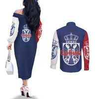 Serbia Flag Couples Matching Off The Shoulder Long Sleeve Dress and Long Sleeve Button Shirt with Double-Headed Eagle and National Coat of Arms Design