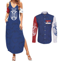 Serbia Flag Couples Matching Summer Maxi Dress and Long Sleeve Button Shirt with Double-Headed Eagle and National Coat of Arms Design