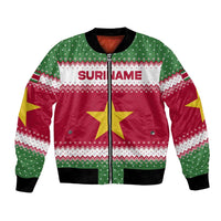Suriname Christmas Bomber Jacket with Red-Green Knit Pattern, Yellow Star, and Santa Leopard Motif