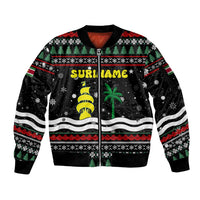 Suriname Christmas Sleeve Zip Bomber Jacket with Black Festive Pattern, Golden Ship, Palm Tree, and Coat of Arms Motif