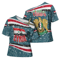 Turn heads and express your unique style with the Syria Christmas Cross Shoulder Shirt with National Flag Motif, Coat of Arms Eagle, and Festive Snowflake Pattern from Wonder Print Shop. Perfect for casual outings, festivals, or making a fashion statement, this custom-made cross shoulder shirt combines high-end craftsmanship with eye-catching design.