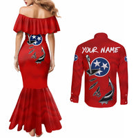 Tennessee Flag Fishing Couples Matching Mermaid Dress and Long Sleeve Button Shirt with Ripped Hook Graphic and Triple Star Symbol in Red and Blue
