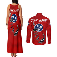 Tennessee Flag Fishing Couples Matching Tank Maxi Dress and Long Sleeve Button Shirt with Ripped Hook Graphic and Triple Star Symbol in Red and Blue