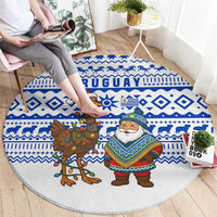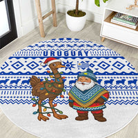 Uruguay Christmas Round Carpet with Santa Claus Rhea Bird Holiday Lights and Blue Geometric Pattern