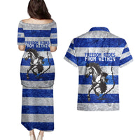Uruguay Couples Matching Puletasi and Hawaiian Shirt with Wild Horse Illustration Blue Gray Striped