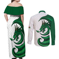 Wales Celtic Dragon Couples Matching Off Shoulder Maxi Dress and Long Sleeve Button Shirt Welsh Mythic Green Dragon