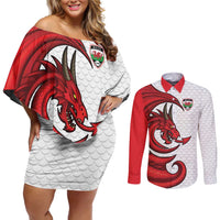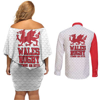 Wales Rugby Red Dragon Couples Matching Off Shoulder Short Dress and Long Sleeve Button Shirt Cymru Am Byth