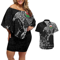 Wales Viking Ravens Couples Matching Off Shoulder Short Dress and Hawaiian Shirt Vegvisir Runes Pattern
