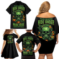 Your Demons Hide Under Your Bed Skull Halloween Family Matching Off Shoulder Short Dress and Hawaiian Shirt