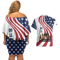 911 Memorial Couples Matching Off Shoulder Short Dress and Hawaiian Shirt Patriot Day American Flag and Soldier Silhouette Honor and Remember