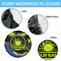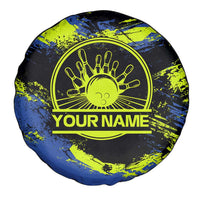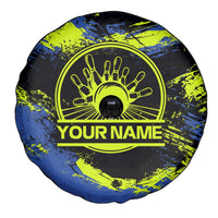 Abstract Blue and Yellow Bowling Ball Strike Design Spare Tire Cover with Custom Name Print