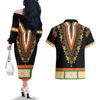 Africa Dashiki Couples Matching Off The Shoulder Long Sleeve Dress and Hawaiian Shirt Embroidery Neckline Floral Pattern