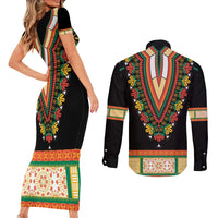 Africa Dashiki Couples Matching Short Sleeve Bodycon Dress and Long Sleeve Button Shirt Embroidery Neckline Floral Pattern
