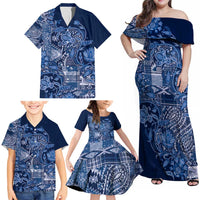 Africa Floral mix Maasai Shuka Family Matching Off Shoulder Maxi Dress and Hawaiian Shirt Blue Moitf