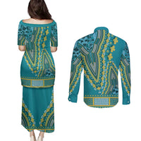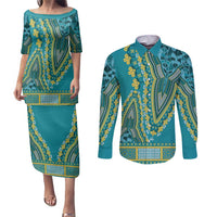 African Dashiki Couples Matching Puletasi and Long Sleeve Button Shirt Luxury Teal