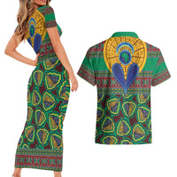 African Pattern Traditional Kanga Style Couples Matching Short Sleeve Bodycon Dress and Hawaiian Shirt