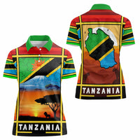 African Sunset Design Women Polo Shirt with Flag Map Mount Kilimanjaro and Wildlife Scene