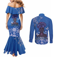 African Women Couples Matching Mermaid Dress and Long Sleeve Button Shirt Black Beautiful Brave and Bressed - Blue Color