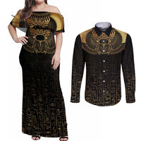 Ancient Egypt Scarab Couples Matching Off Shoulder Maxi Dress and Long Sleeve Button Shirt Black Gold