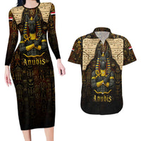 Anubis Egypt Couples Matching Long Sleeve Bodycon Dress and Hawaiian Shirt with Ancient Hieroglyph Pharaoh Spirit