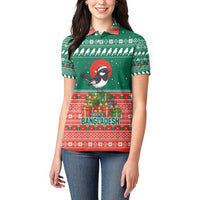 Bangladesh Christmas Women Polo Shirt with Black-Capped Bird Gift Stack and Green Red Snowflake Pattern