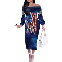 Bass Fishing Off The Shoulder Long Sleeve Dress American Flag Patriotic and Cosmic Galaxy in Blue Red TS04