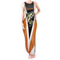 Bass Fishing Tank Maxi Dress Jumping Largemouth Fish on Black Hex Pattern and Orange White Lightning Accents
