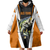 Bass Fishing Wearable Blanket Hoodie Jumping Largemouth Fish on Black Hex Pattern and Orange White Lightning Accents