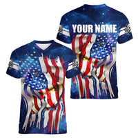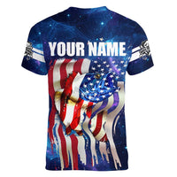 Bass Fishing Women V-Neck T-Shirt American Flag Patriotic and Cosmic Galaxy in Blue Red TS04
