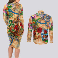 Bermuda Couples Matching Long Sleeve Bodycon Dress and Long Sleeve Button Shirt Geographic Coordinate Anchor - Turlte Tropical