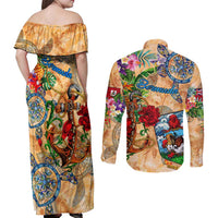 Bermuda Couples Matching Off Shoulder Maxi Dress and Long Sleeve Button Shirt Geographic Coordinate Anchor - Turlte Tropical