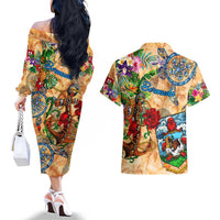 Bermuda Couples Matching Off The Shoulder Long Sleeve Dress and Hawaiian Shirt Geographic Coordinate Anchor - Turlte Tropical