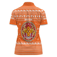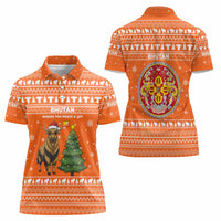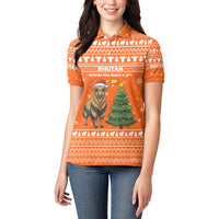 Bhutan Christmas Women Polo Shirt with Takin Santa Hat Christmas Tree and Snowflake Pattern in Orange