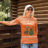 Bhutan Christmas Women Polo Shirt with Takin Santa Hat Christmas Tree and Snowflake Pattern in Orange TS04