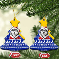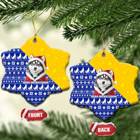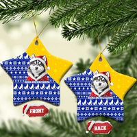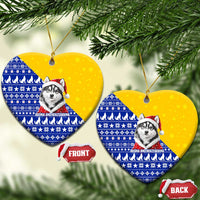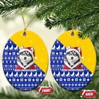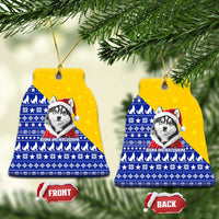 Bosnia and Herzegovina Christmas Ceramic Ornament with Husky Dog Santa Hat and Blue Yellow Snowflake Pattern