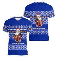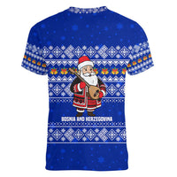 Bosnia and Herzegovina Christmas Women V-Neck T-Shirt with Santa Playing Traditional Instrument and Blue Snowflake Pattern