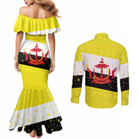 Brunei Christmas Couples Matching Mermaid Dress and Long Sleeve Button Shirt with Cartoon Monkey Santa Hat Candy Cane and Yellow Black Flag Pattern