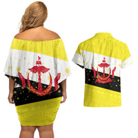 Brunei Christmas Couples Matching Off Shoulder Short Dress and Hawaiian Shirt with Cartoon Monkey Santa Hat Candy Cane and Yellow Black Flag Pattern