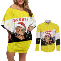 Brunei Christmas Couples Matching Off Shoulder Short Dress and Long Sleeve Button Shirt with Cartoon Monkey Santa Hat Candy Cane and Yellow Black Flag Pattern