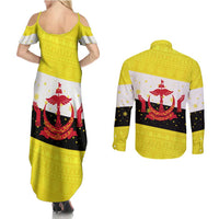 Brunei Christmas Couples Matching Summer Maxi Dress and Long Sleeve Button Shirt with Cartoon Monkey Santa Hat Candy Cane and Yellow Black Flag Pattern TS04