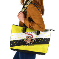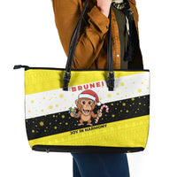 Brunei Christmas Leather Tote Bag with Cartoon Monkey Santa Hat Candy Cane and Yellow Black Flag Pattern
