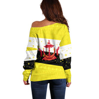Brunei Christmas Off Shoulder Sweater with Cartoon Monkey Santa Hat Candy Cane and Yellow Black Flag Pattern TS04