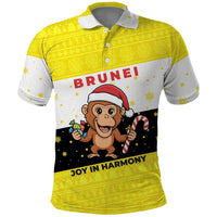 Brunei Christmas Polo Shirt with Cartoon Monkey Santa Hat Candy Cane and Yellow Black Flag Pattern