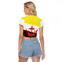Brunei Christmas Raglan Cropped T Shirt with Cartoon Monkey Santa Hat Candy Cane and Yellow Black Flag Pattern