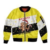 Brunei Christmas Sleeve Zip Bomber Jacket with Cartoon Monkey Santa Hat Candy Cane and Yellow Black Flag Pattern