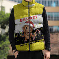 Get your Brunei Christmas Sleeveless Puffer Jacket with Cartoon Monkey Santa Hat Candy Cane and Yellow Black Flag Pattern by Wonder Print Shop today and experience warmth, style, and versatility in one perfect piece.
