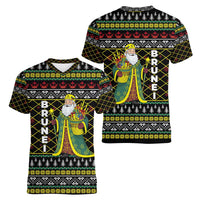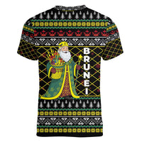 Brunei Christmas Women V-Neck T-Shirt with Traditional Santa Gift Basket and Black Yellow Red Holiday Pattern